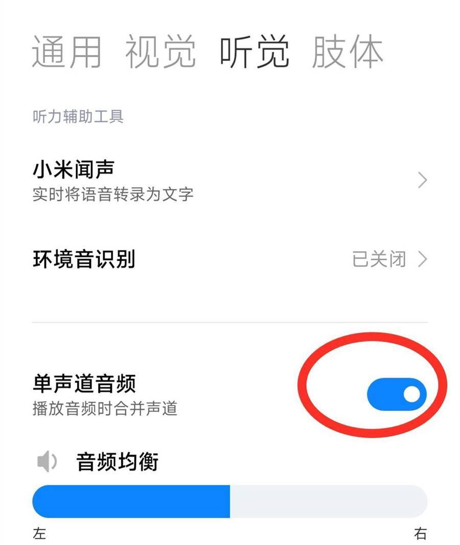 打開單聲道音頻之后,把下面的單聲道音頻開關打開就可以了,因為這個開關默認的關掉的,需要我們手動打開,打開之后,就不會出現打電話時聲音小的情況了!