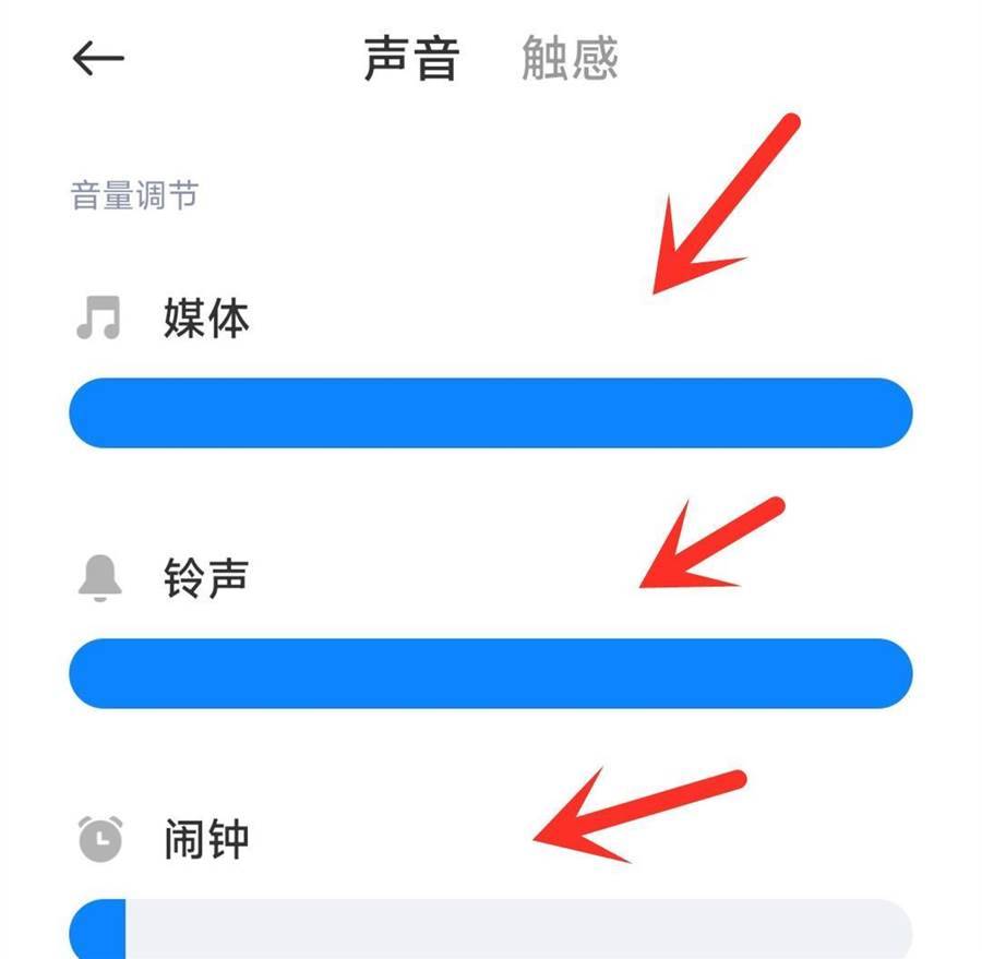 打開之后,在這邊就可以設置我們的手機音量了,我們要做的第一個就是把媒體音量全部調到最大,我們把開關往右滑動,把進度條拉滿,全部變成藍色就是開到最大了,媒體音調完之后,我們再把下面的鈴聲和鬧鐘這2個聲音也全部調到最大,打開這3個開關之后,我們在聽音樂,鬧鐘,接電話的時候,就能馬上聽到聲音,而不會出現聲音小的情況了!