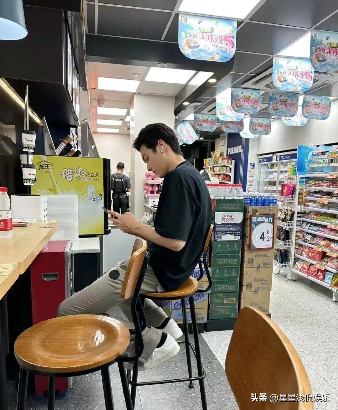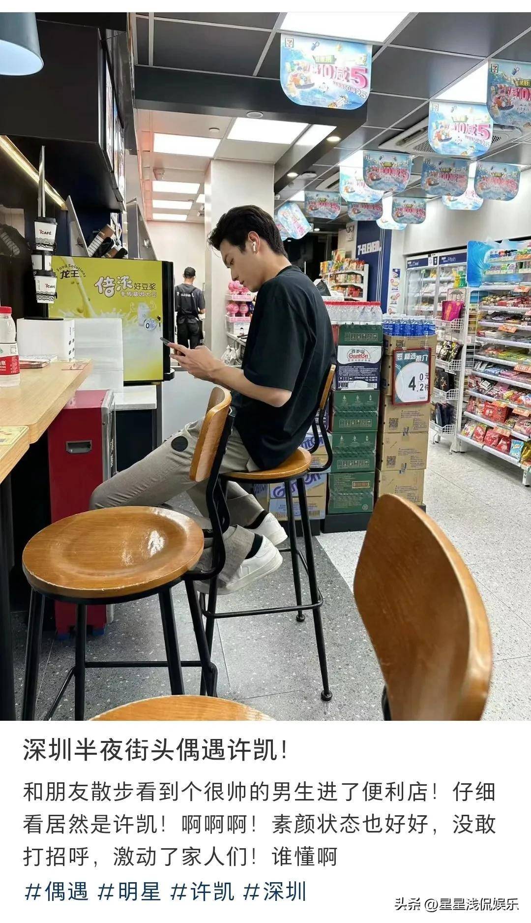 照片中许凯坐在便利店的椅子上玩着手机,他穿着休闲,不仅没化妆而且连口罩也没带,估计也是想着已经凌晨了外面应该没什么人了吧,没想到还是被好奇网友认出来了。