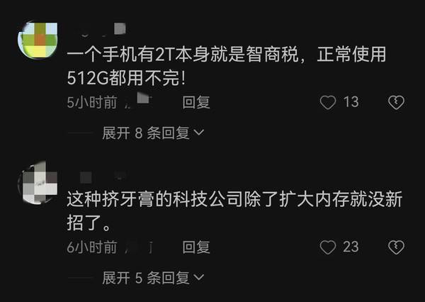 對此,有網友評論稱,「一個手機有2TB本身就是智商稅,正常使用512GB都用不完!」「這種擠牙膏的科技公司除了擴大內存就沒新招了。」