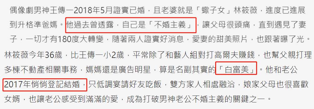 王传一在2016年初自曝结束了一段感情,2017年他就跟林筱薇闪电结婚,看得出来他很喜欢对方。