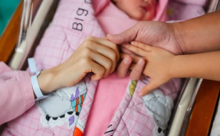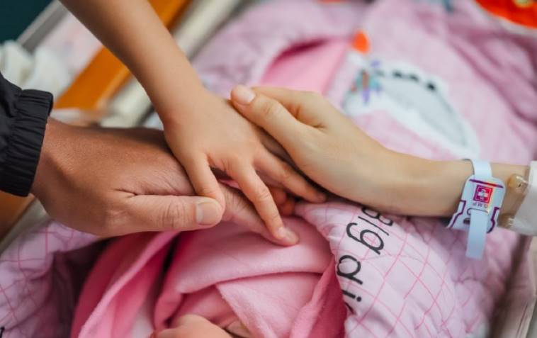王传一与妻子以及大女儿把手放在宝宝的身上,三只手交叠在一起,画面很是温馨有爱。