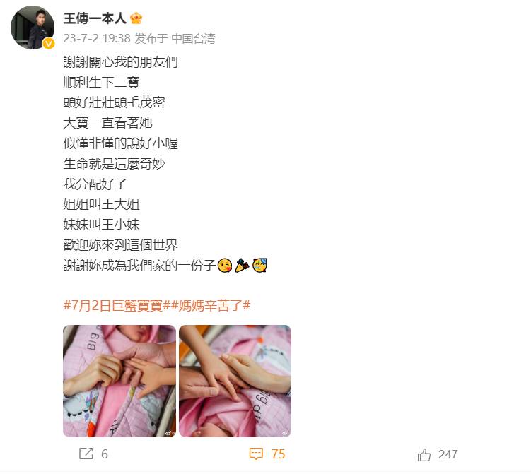 7月2日,知名男星王传一透过个人社交账号宣布二胎得女,消息一出,粉丝们纷纷留言恭喜。