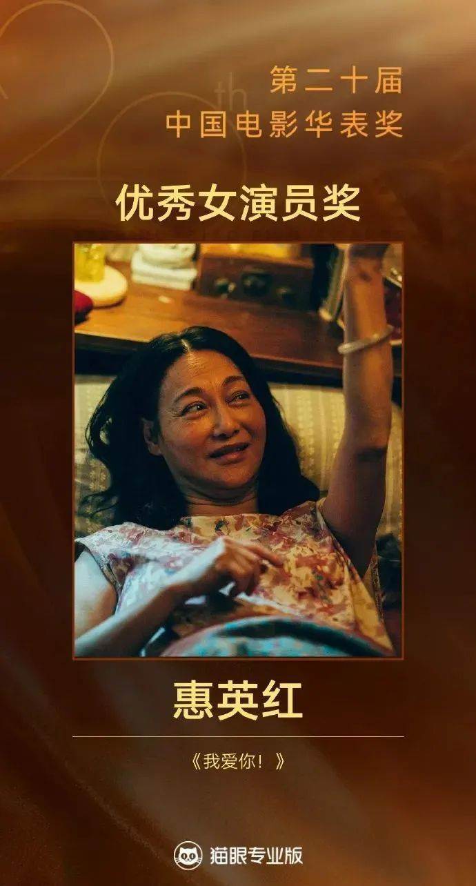 第二十屆電影華表獎揭曉,65歲的惠英紅憑藉電影《我愛你!》獲優秀女演員獎,她是第一位獲此殊榮的香港女演員。