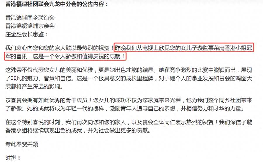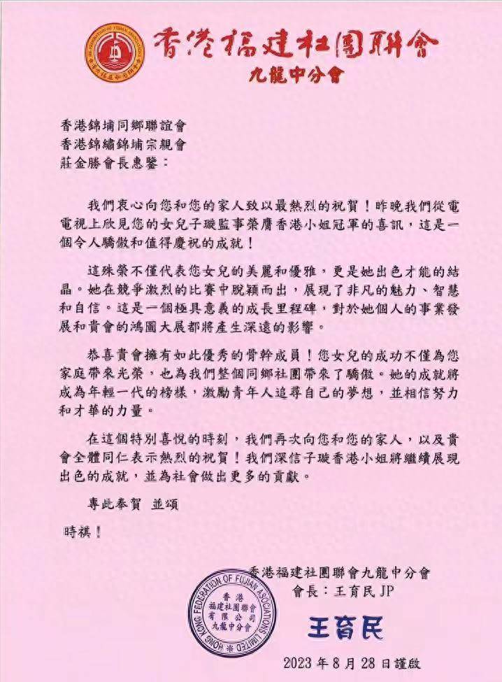 昨日(28日)香港福建社團聯會九龍中分會亦出公告,祝賀莊金勝會長的女兒榮膺香港小姐冠軍,是一個令人驕傲和值得慶祝的成就。